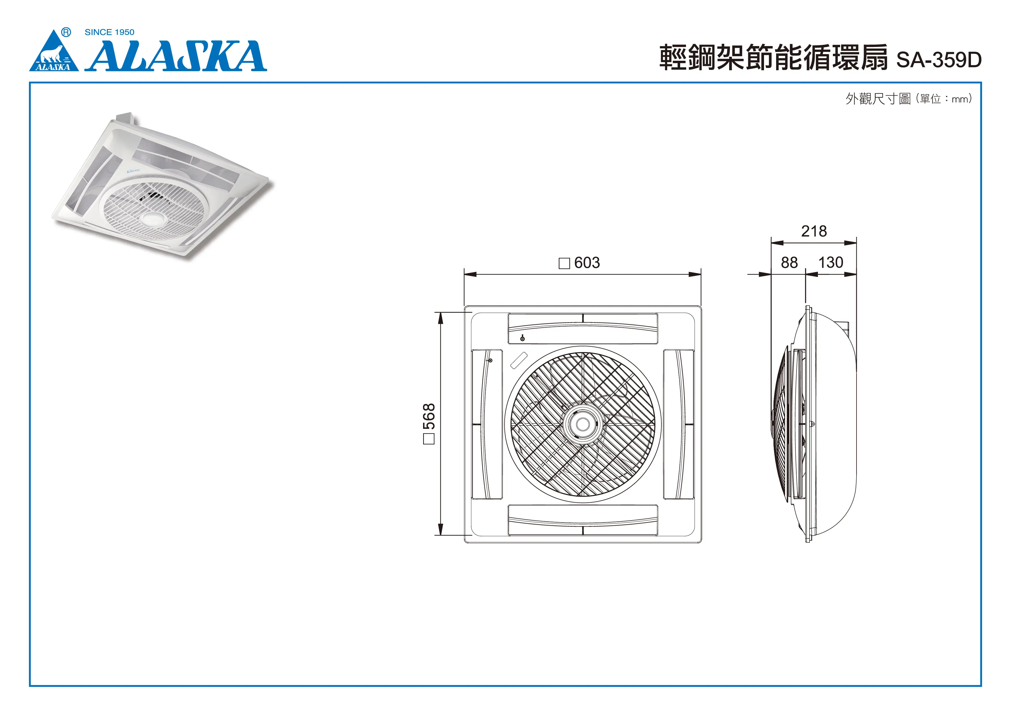 | 電源 | 轉速 | 消耗功率 (w) | 總風量 (m3/h) | 標稱風量 (m3/h) | 噪音 (dBA) | 扇葉直徑 (mm) | 重量 (kg) | 能源效率 (m3/min/w) | 產品尺寸 (mm) |