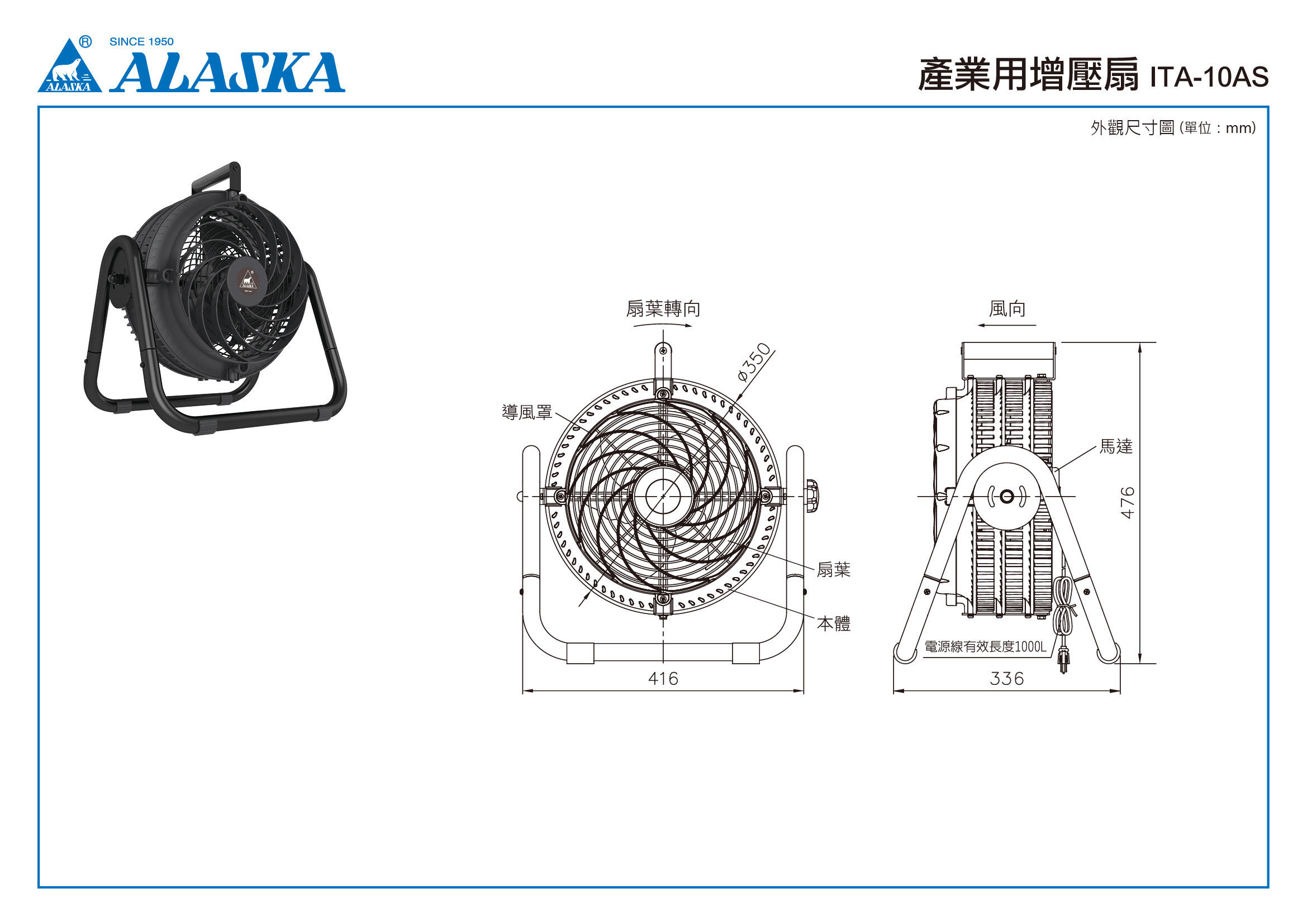 | 立式 (有附輪) | 單相110V~ 60Hz | 強速 | 180 | 4.3 | 1.7 | 59 | 4500 | 350 (14吋) | 13 |