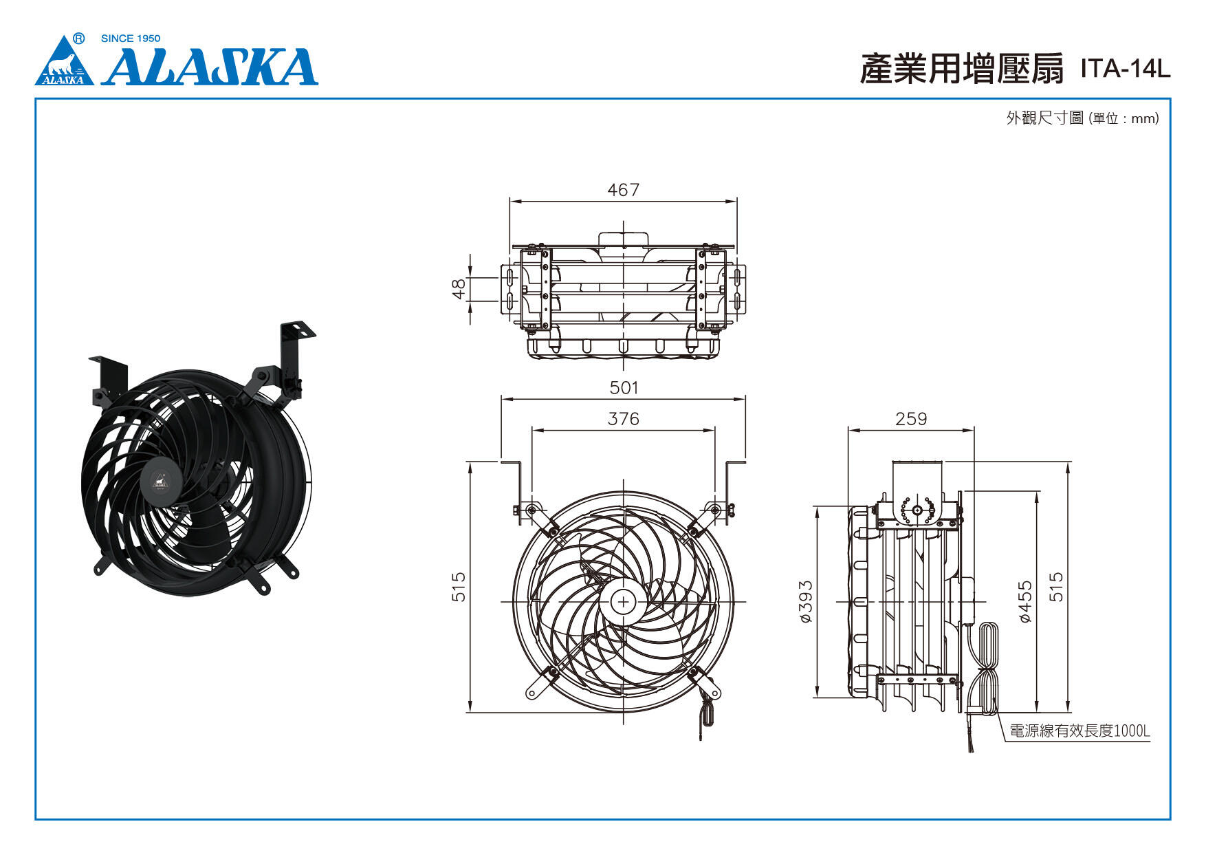 | 吊式、農牧用 | 三相220V~ 60Hz | 單速 | 155 | 2.3 | 0.65 | 57 | 6500 | 350 (14吋) | 7.9 |