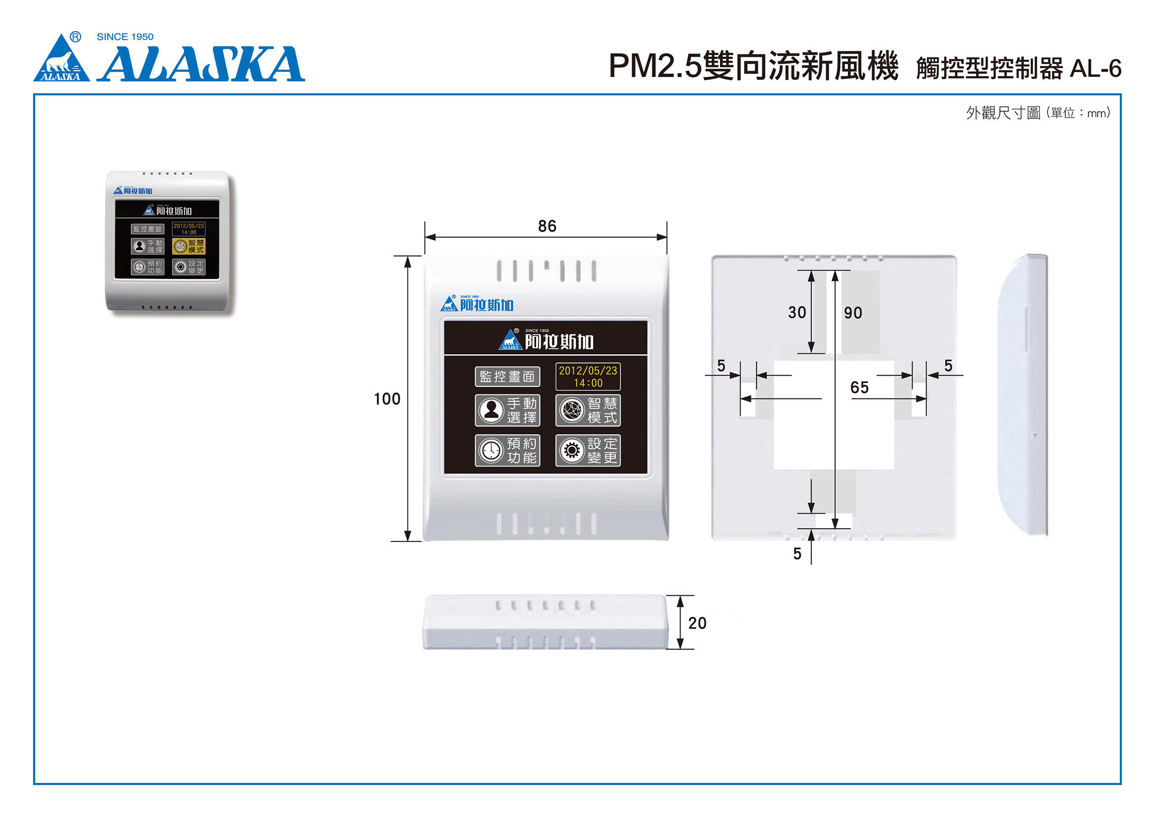 PM2.5雙向流新風機智慧型,搭配 AL-6觸控型控制器,可進行 強/中/弱/高給氣/高排氣 等五段風速,與時間排程等相關控制。