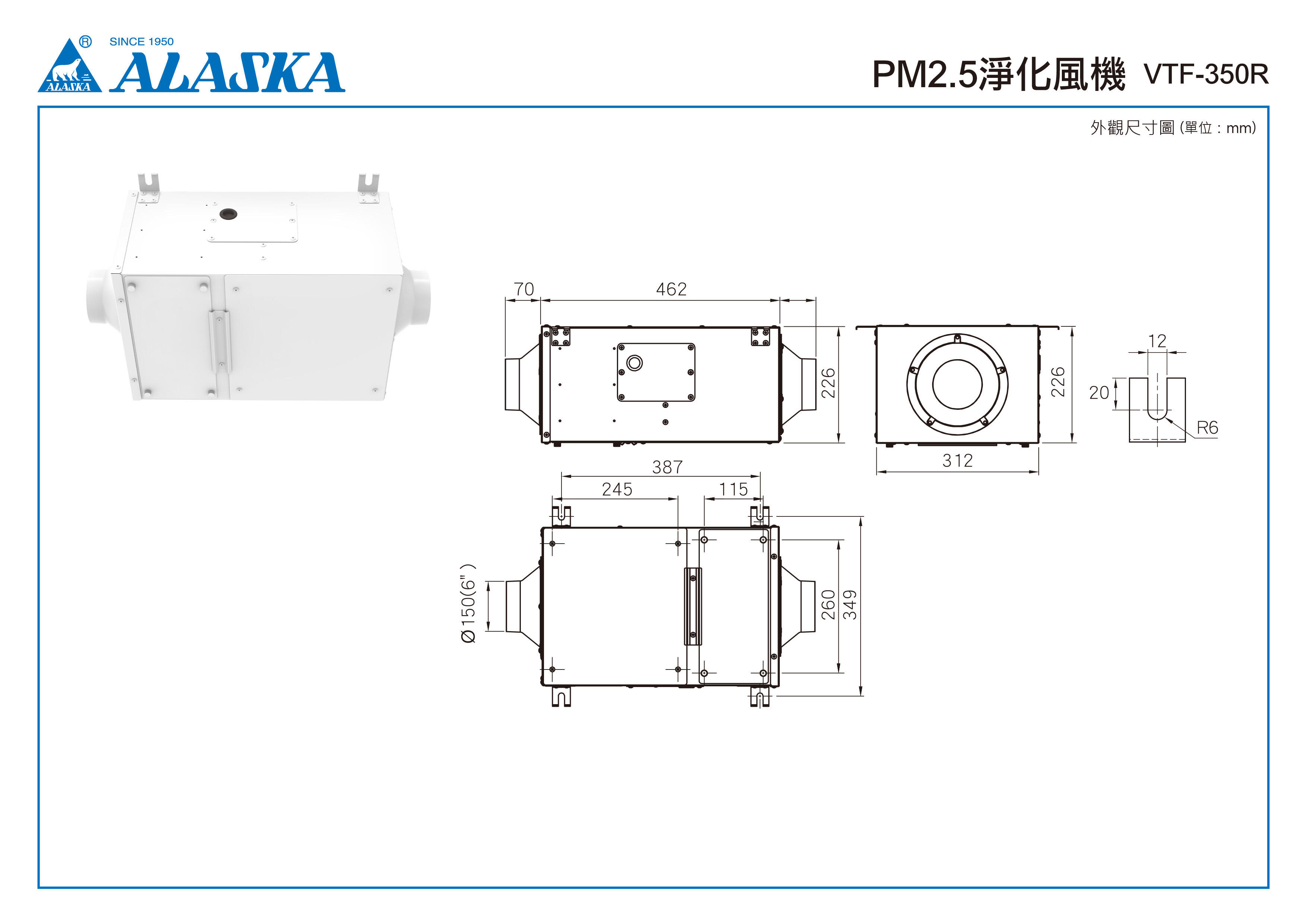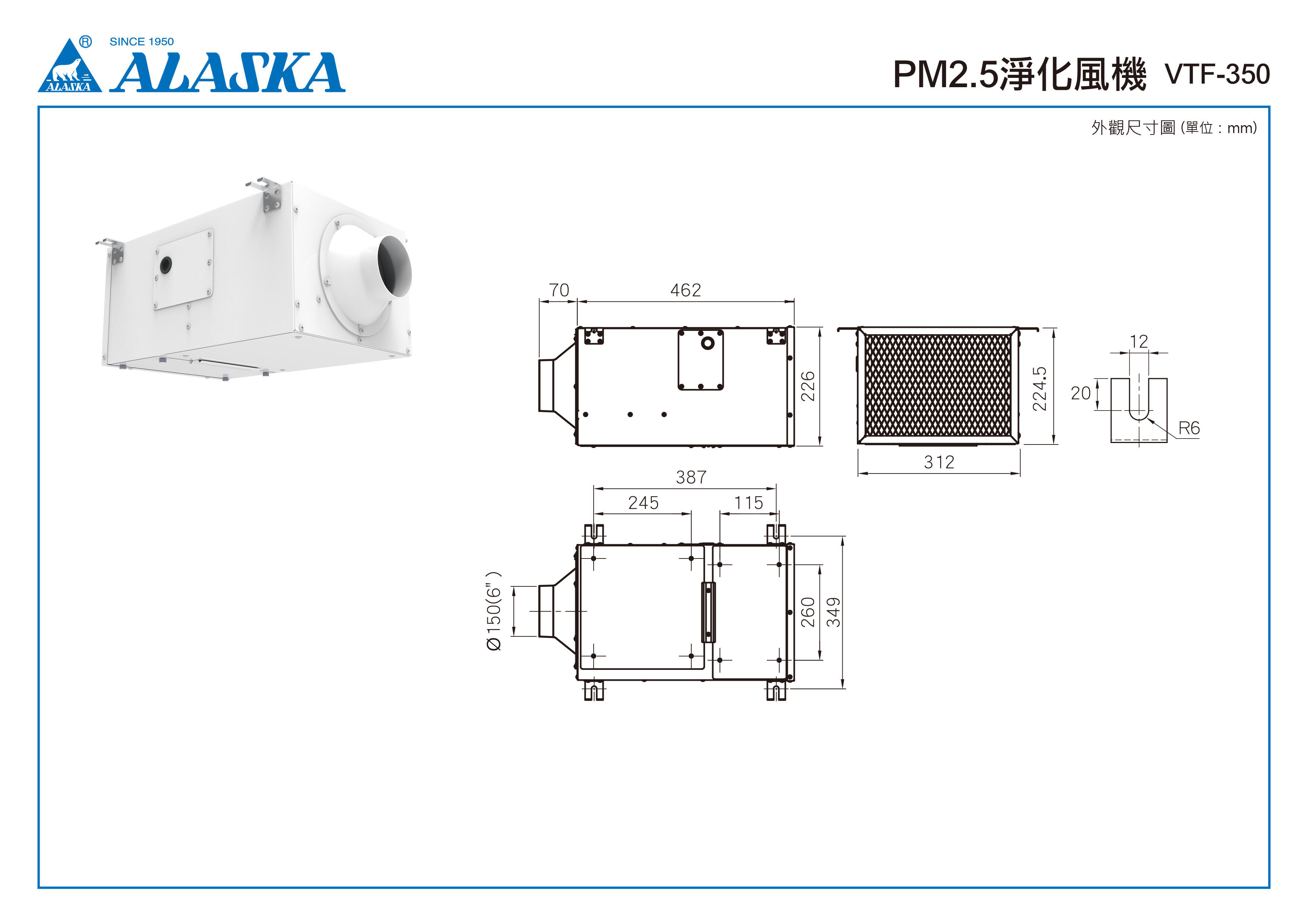 | 安裝於室外側 | 不銹鋼+白色烤漆 | 110V~ 60Hz | 強速 | 350 | 75 | 0.80 | 27 | 47 | 1.0 | Ø150 (6吋) | 9.5 |