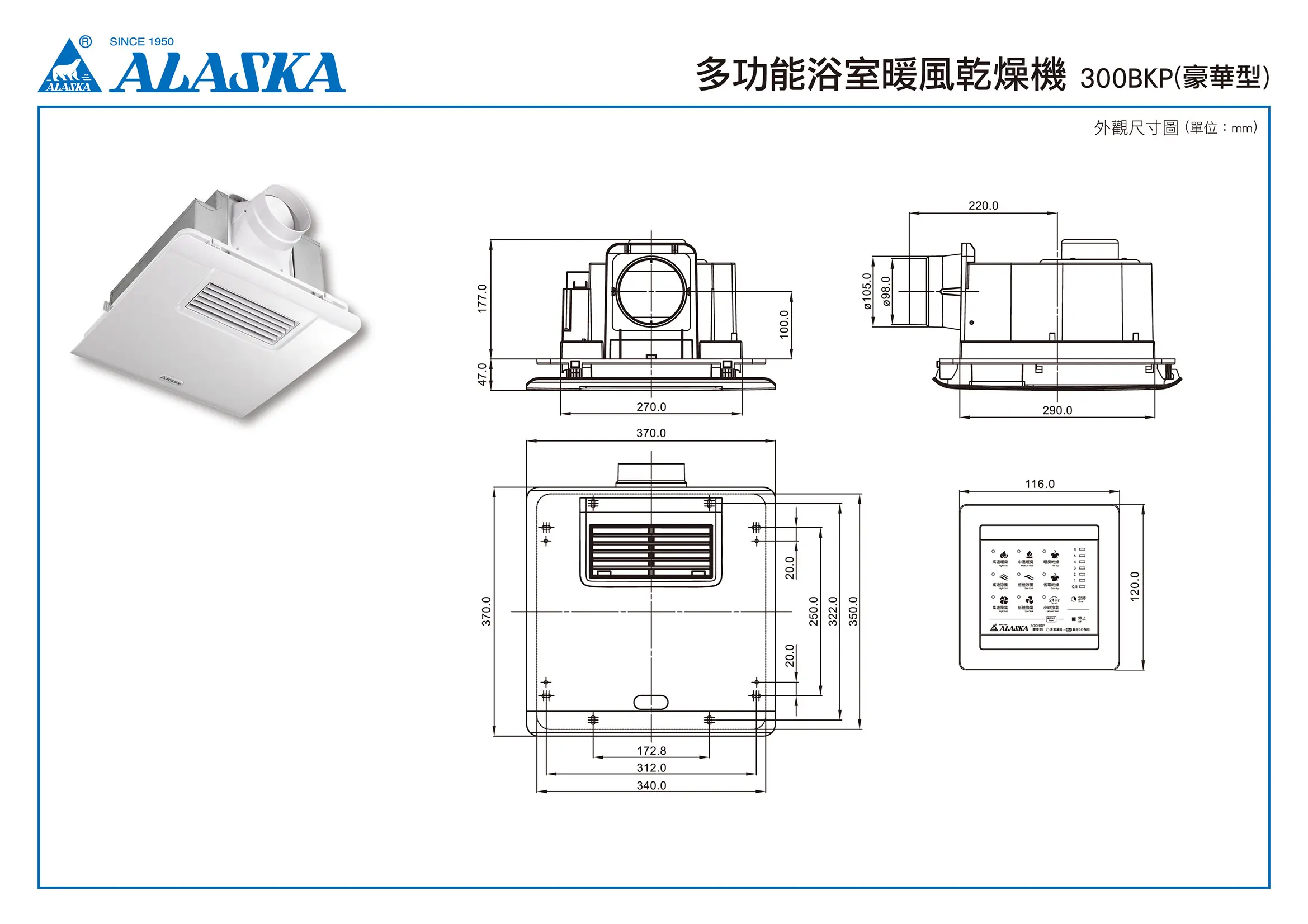 | 110V / 220V 60Hz | 300BKP最大8小時、300BRP最大12小時 | 300BKP 線控、300BRP 遙控 | 5.3 | 300 X 300 X 180 | ∅100 (4吋) |